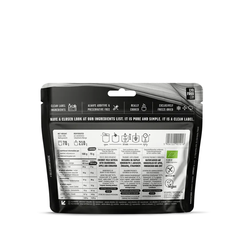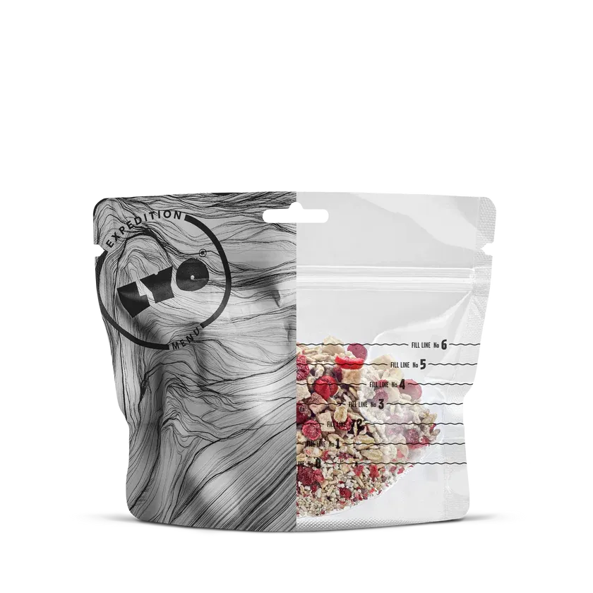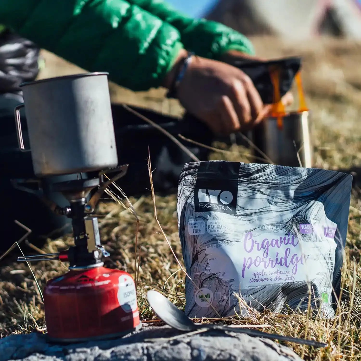 LYOFOOD Apple Cinnamon Porridge er en mild og smakfull grøt med eple, rosiner, havre og kanel – helt uten tilsatt sukker. Den er laget av 100 % naturlige ingredienser og passer perfekt som en rask og næringsrik frokost på fjelltur, ekspedisjon eller camping. Grøten er glutenfri og vegansk, og gir en langvarig metthetsfølelse med god smak og aroma.