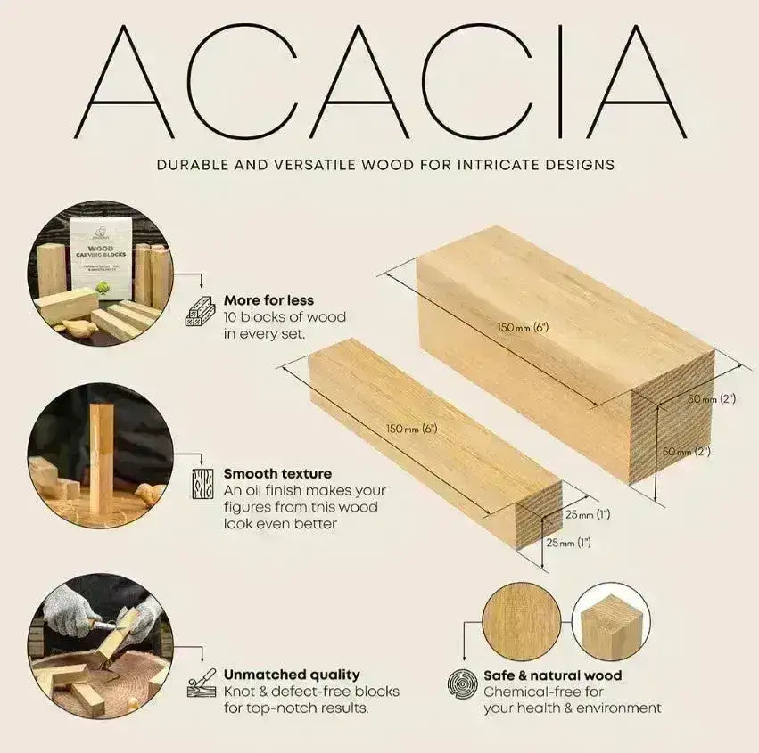 10stk treklosser fra Beaver Craft til treskjæring, klossene er av tresorten Akasie.