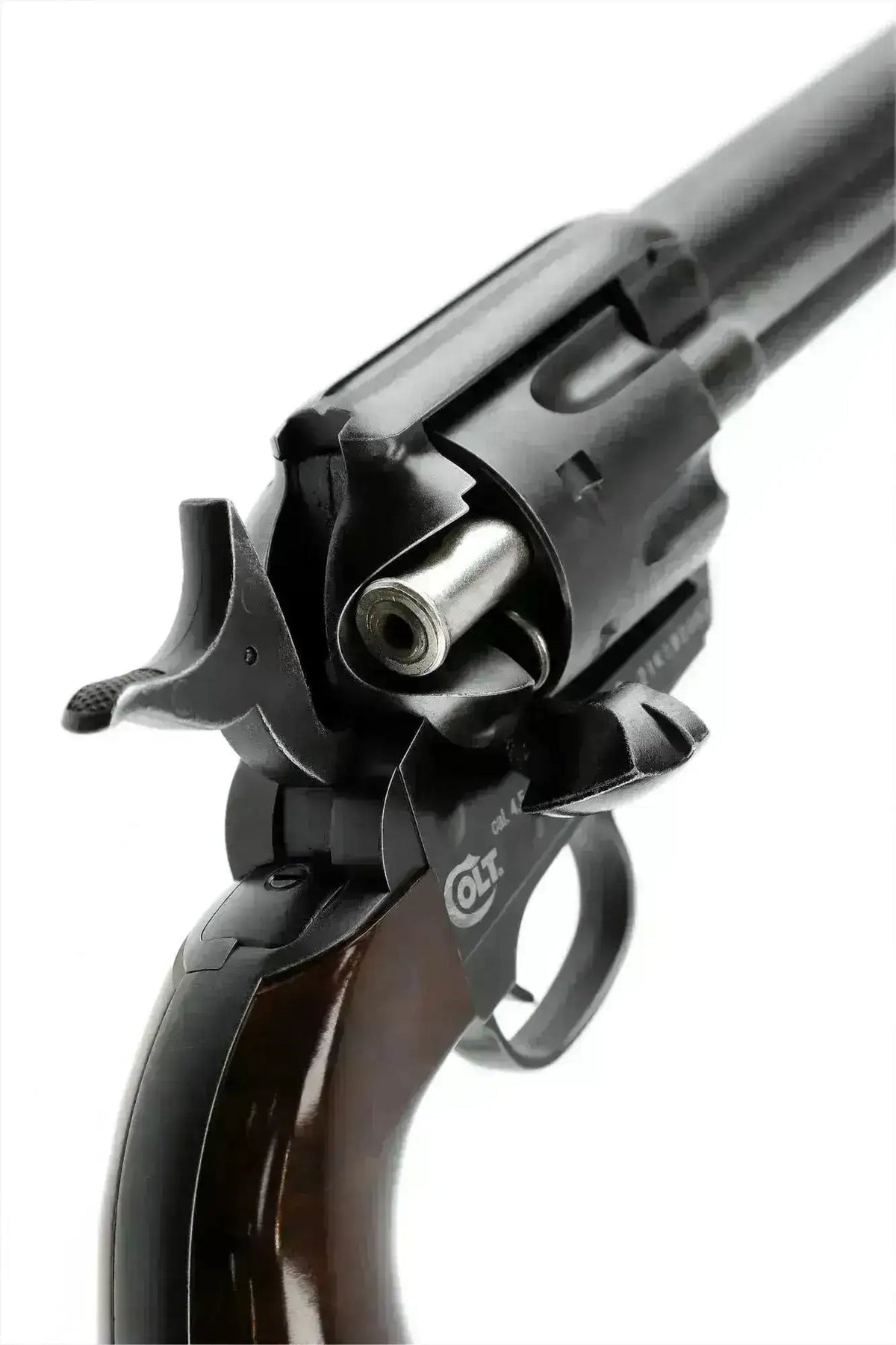 Tämän klassikon 4,5 mm:n BB-versio on todella iloa silmille, ja revolverilla on sama ulkonäkö, tuntu ja toiminnallisuus kuin alkuperäisessä .45 Colt Peacemakerissa. Kuten oikean revolverin, tämänkään piippu ei ulotu. Jokainen patruuna ladataan yksitellen sylinterin oikealla puolella olevaan latausaukkoon. Vedä vasara puoliväliin taakse, käännä sitten piippua ja aseta uusi ladattu patruuna. Poista tyhjä patruuna tekemällä täsmälleen sama vastakkaiseen suuntaan ja painamalla vapautustankoa. Jos haluat ladata patruunoihin BB-palloja, aseta BB-pallo kunkin patruunan pohjaan.