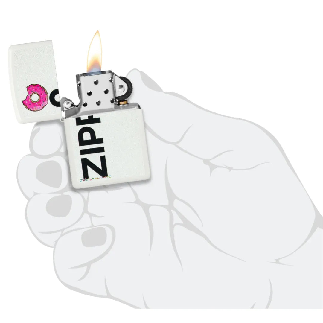 Tee kevyemmästäsi ilme tällä valkoisella mattaisella Zippo-sytyttimellä, jossa on hauska ja katseenvangitsija. Zippo-logoon on integroitu herkullinen himmeä munkkimotiivi värikkäällä kuvalla. Täydellinen lahjaksi tai omaan käyttöön. Toimitetaan lahjapakkauksessa.