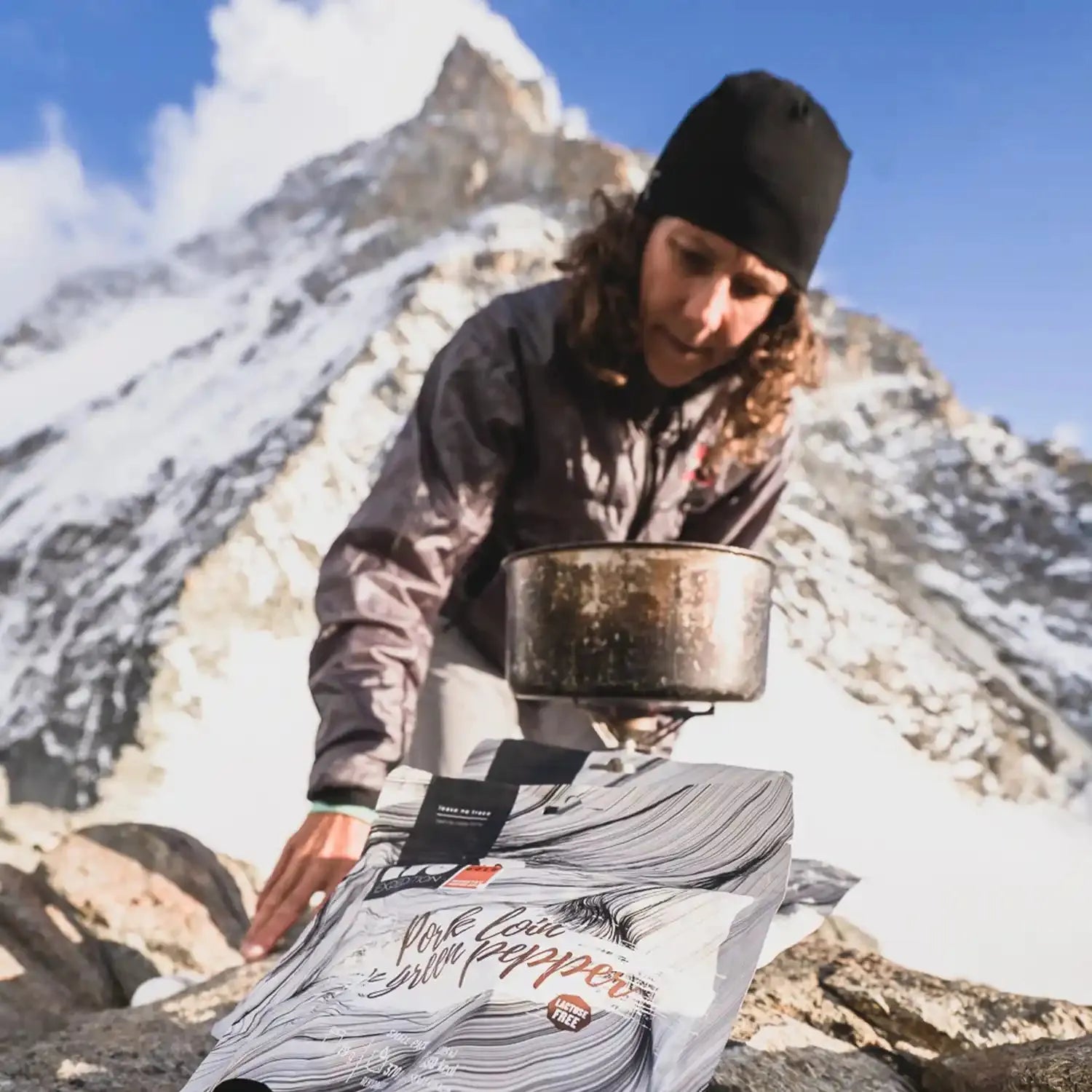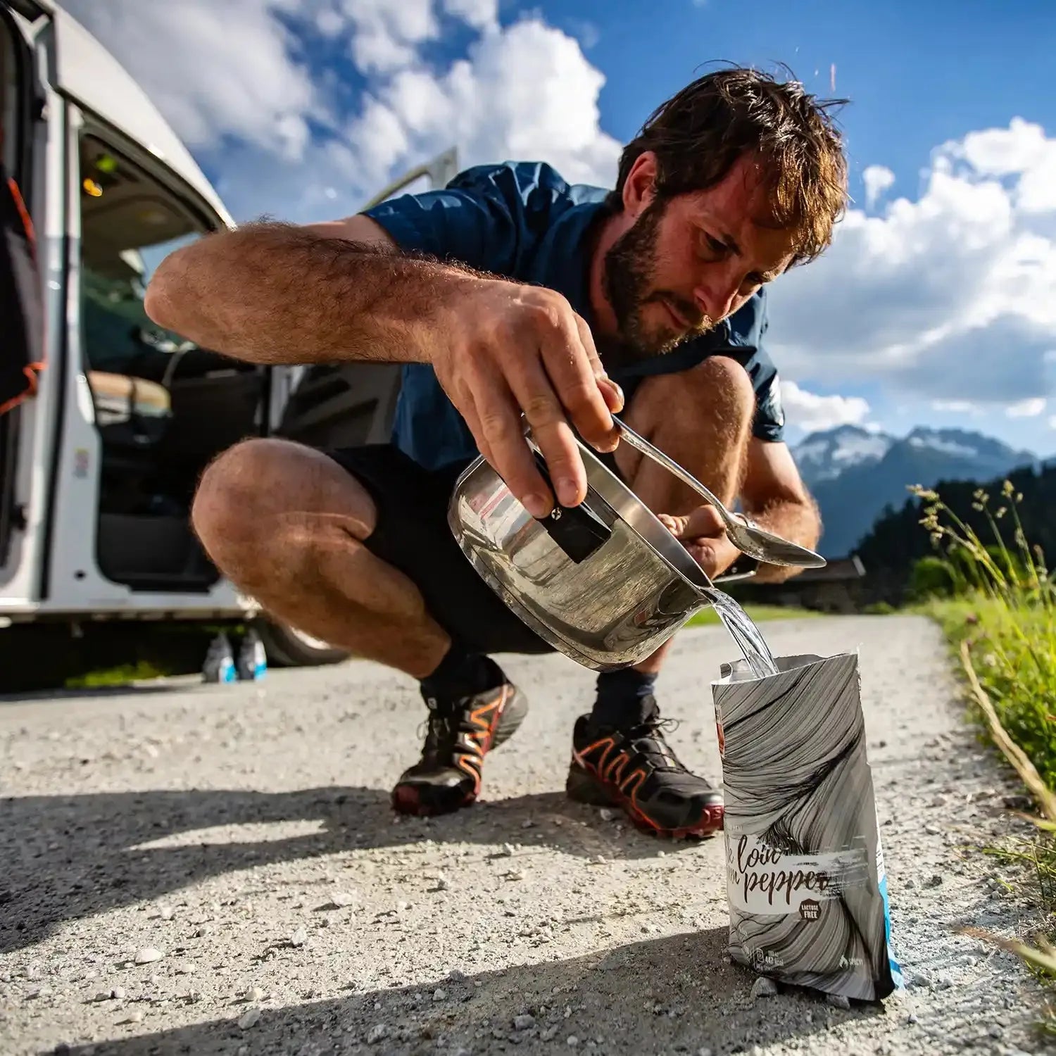 Tilsett kokende vann rett i posen, rør godt og vent i 8–10 minutter. Nyt et varmt og kraftig måltid – hvor enn du er.