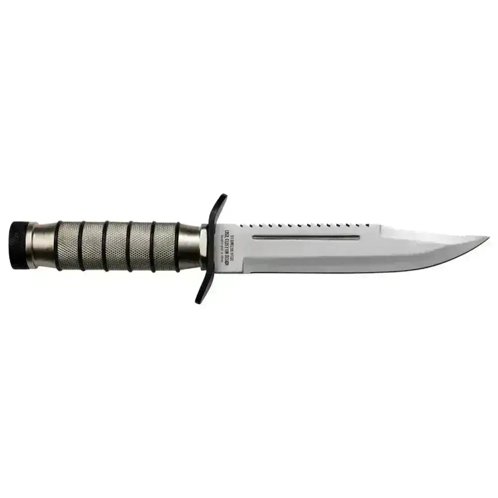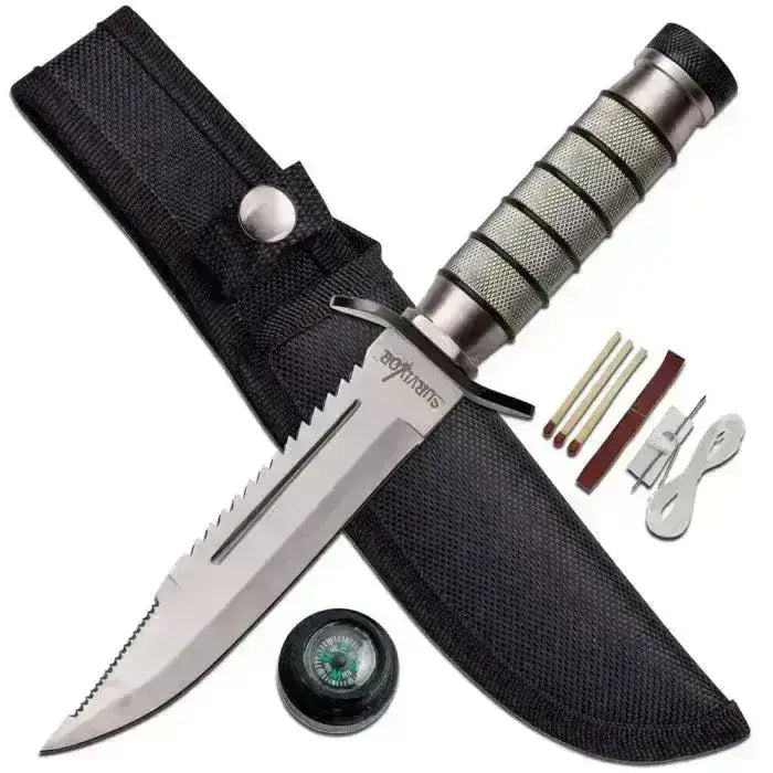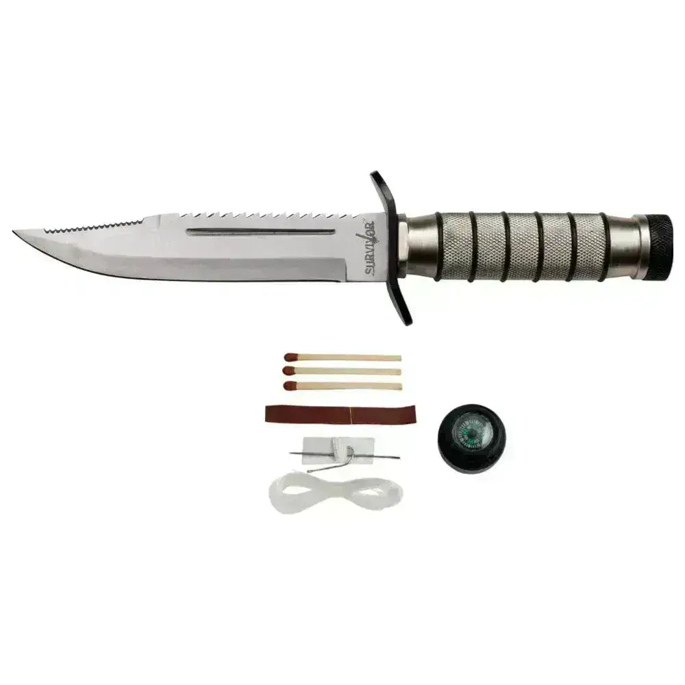 Kiinteäteräinen HK-695 Survivor-veitsi, jossa on hammastukset ja selviytymispakkaus, on ihanteellinen työkalu ulkoilun harrastajille ja selviytymisasiantuntijoille. 24 cm:n kokonaispituudellaan se on kompakti mutta riittävän tukeva vaativiin matkoihin. Veitsen kestävä alumiinikahva tarjoaa hyvän pidon ja kestävyyden myös haastavissa olosuhteissa.