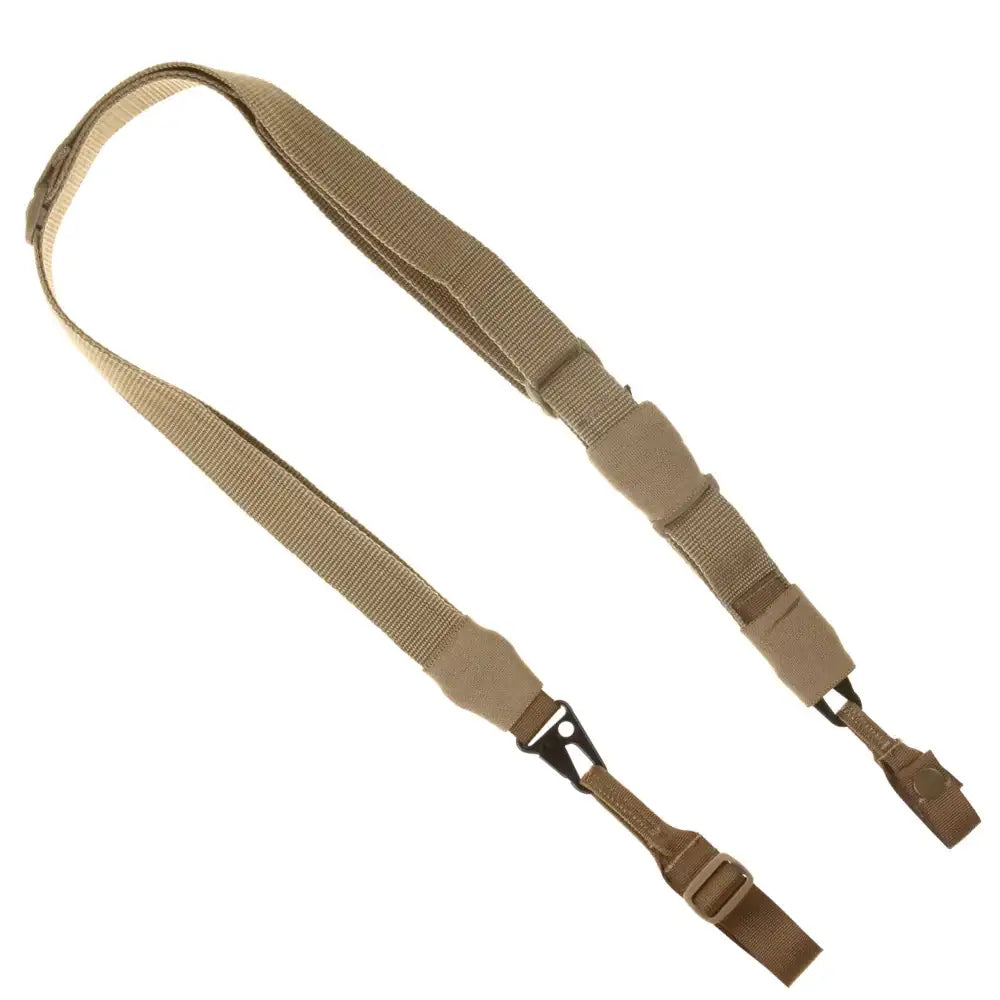 TX-3 säädettävä aseen hihna. Hihna on väriltään kellanruskea ja siinä on metallipidikkeet ja narut, joiden avulla voit kiinnittää hihnan useilla tavoilla. Voit kiinnittää pidikkeen toisiinsa tehdäksesi siitä 1-pisteisen hihnan.