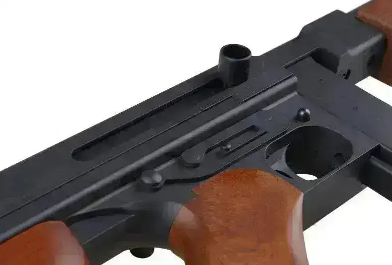 Tämä ikoninen airsoft SMG -kivääri tunnetaan hyvin roolistaan mafiaelokuvissa ja peleissä. Thomson M1A1 näki päivänvalon vuonna 1917, kohti ensimmäisen maailmansodan loppua. Tämä kivääri on valmistettu teräksestä, metalliseoksesta ja ABS:stä. Runko, piippu ja tähtäimet on valmistettu metallista - kun taas tukki, etuosa ja pistoolin kahva on valmistettu ABS-muovista. hyvä laatu, yksityiskohtaisesti puun jäljitelmä. Hihnateline ja lehden kansi saavat paljon ulkoosien kulumista, minkä vuoksi ne on valmistettu teräksestä.