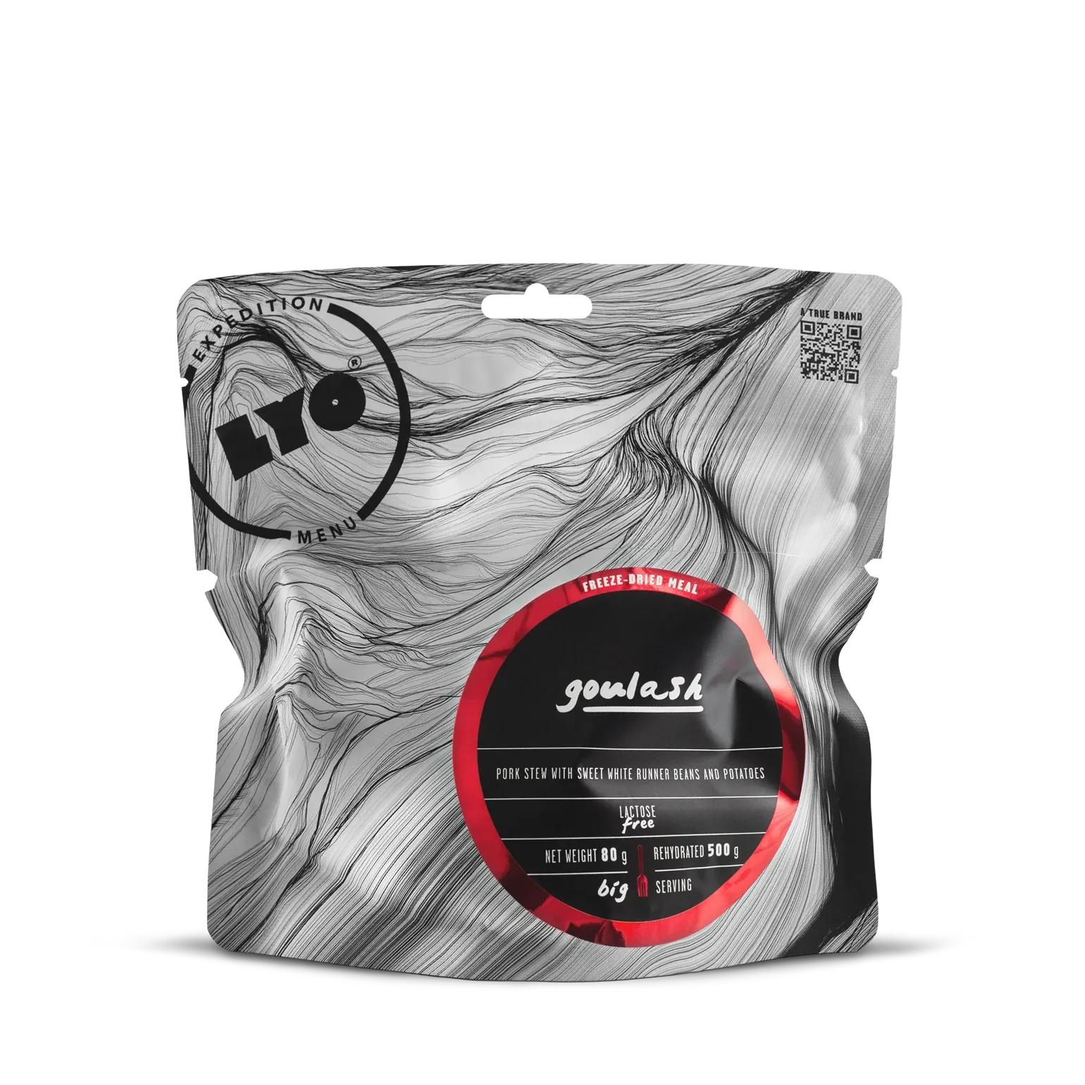LYOFOOD Goulash er en varmende og smakfull svinegryte inspirert av den ungarske klassikeren. Retten inneholder møre biter av svinekjøtt, hvite bønner og potet i en kraftig tomatbasert saus sammen med gulrot, paprika og persillerot. Med 100 % naturlige ingredienser og lang holdbarhet er dette en perfekt middag for fjelltur, jakt eller ekspedisjon – uansett vær og sesong.