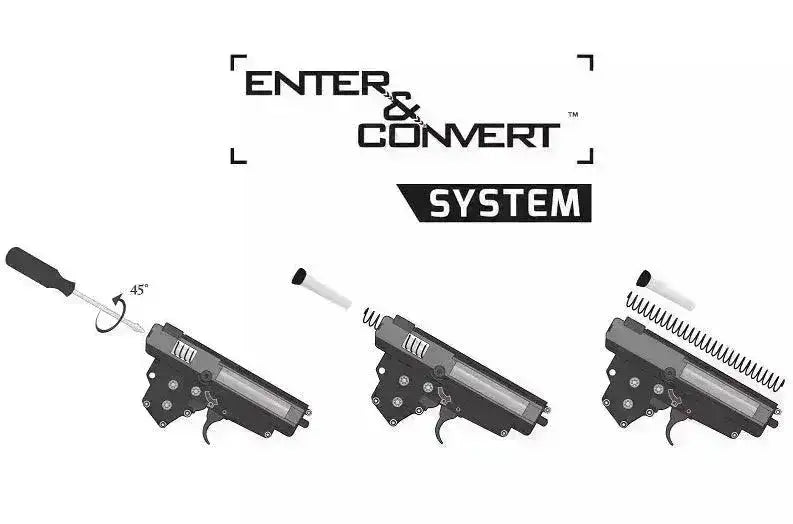 Suoraan laatikosta otettu kivääri tuottaa 380 fps. Täydellinen keskisuurille etäisyyksille. Jos aiot pelata sisä / CQB, suosittelemme siirtymistä toimitettuun M90 -jouseen, niin tulet noin 310 fps. Tämä menee helposti ENTER -järjestelmän ansiosta ja muuntaa järjestelmän - jonka avulla voit muuttaa höyheniä muutamassa minuutissa tarvitsematta purkaa koko kivääriä.