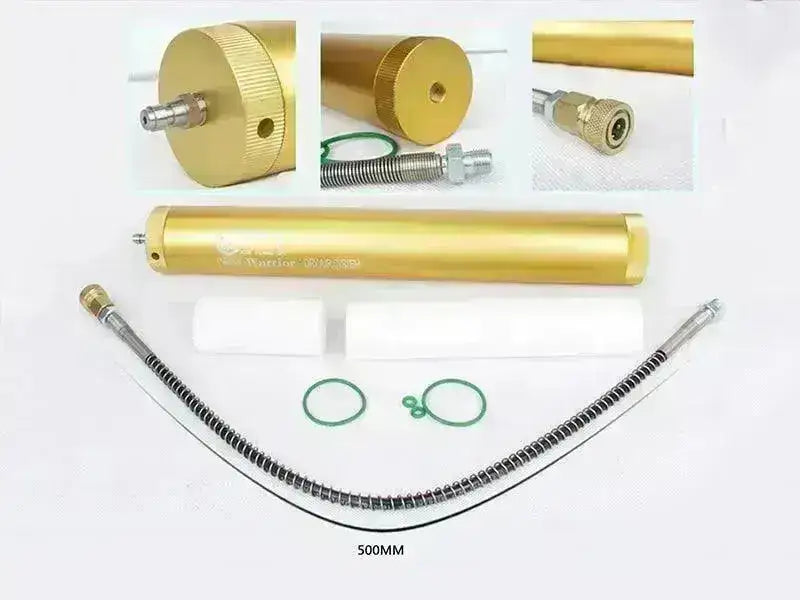Suodattimen mukana tulee erilaisia tiivisteitä ja 500 mm pitkä täyttöletku, jossa on naaras QD-pikaliitin (vakio 8 mm). Itse suodattimessa on urospuolinen QD-pikaliitin.