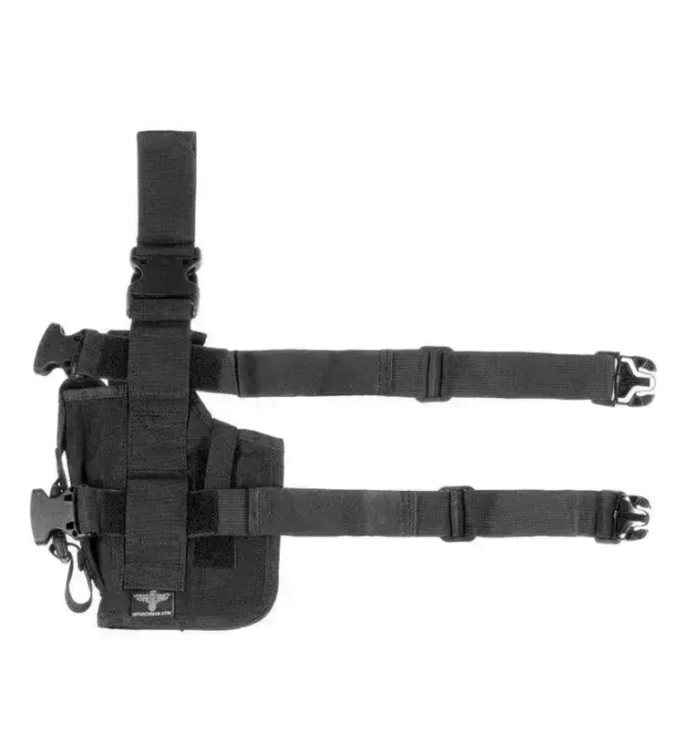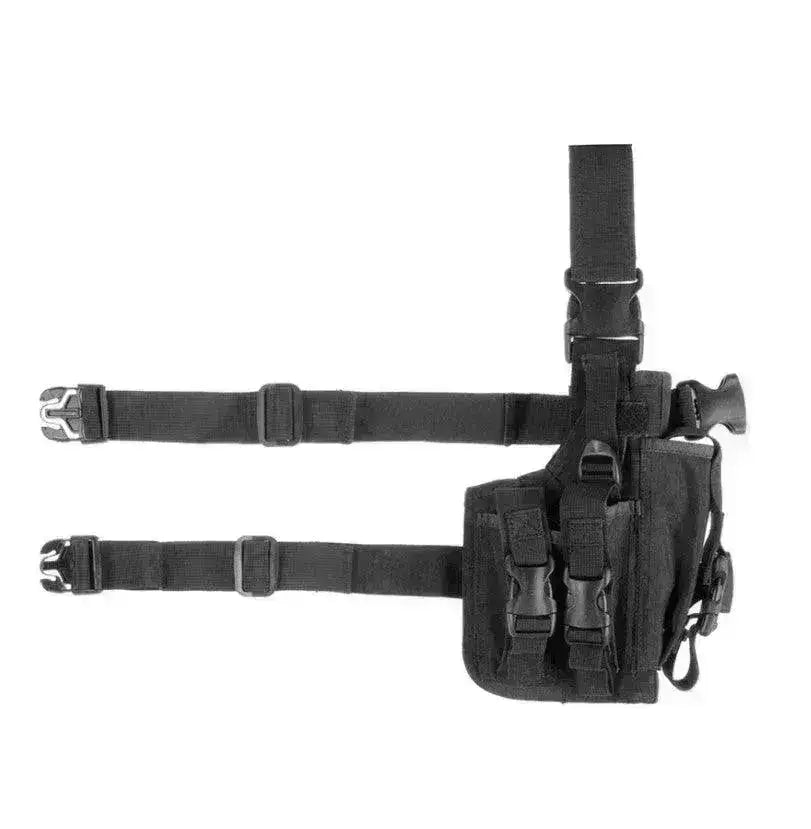 Säädettävä reisikotelo, joka sopii monenlaisiin pistooleihin. Kotelot voidaan kiinnittää vyön ja reiden ympärille niin, että se istuu tukevasti.