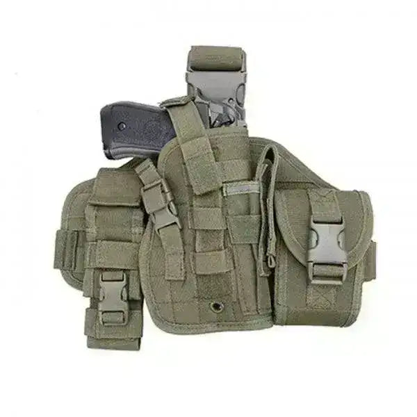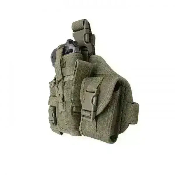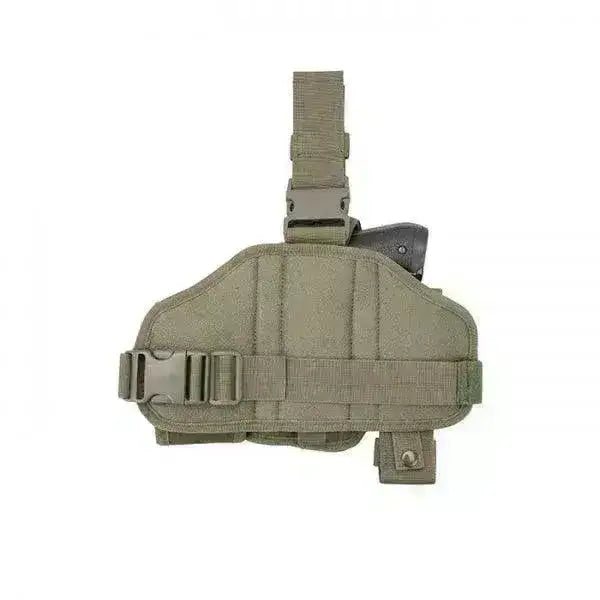 Tämä reisikotelo ei ole perinteinen reisikotelo, se on "jalkapaneeli", johon on kiinnitetty irrotettava pistoolikotelo. Itse paneeli on valmistettu nailonkuidusta ja varustettu MOLLE-kiinnikkeillä, joilla voit kiinnittää haluamasi molle-tarvikkeet reiteen. Mukana oleva pistoolikotelo sopii valtaosaan pistooleista ja on helposti irrotettavissa, jos esimerkiksi käytät sitä mieluummin löysästi vyökotelona ja mieluummin paneelia johonkin muuhun.