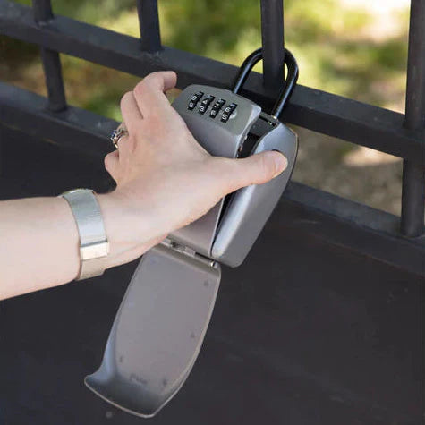 Nøkkelboksen har 4-sifret kode (sett din egen kombinasjon) og en bøyle for enkel, portabel montering der det passer best. Den har også en værbeskyttende cover som skjermer koden mot vær, skitt og støv.