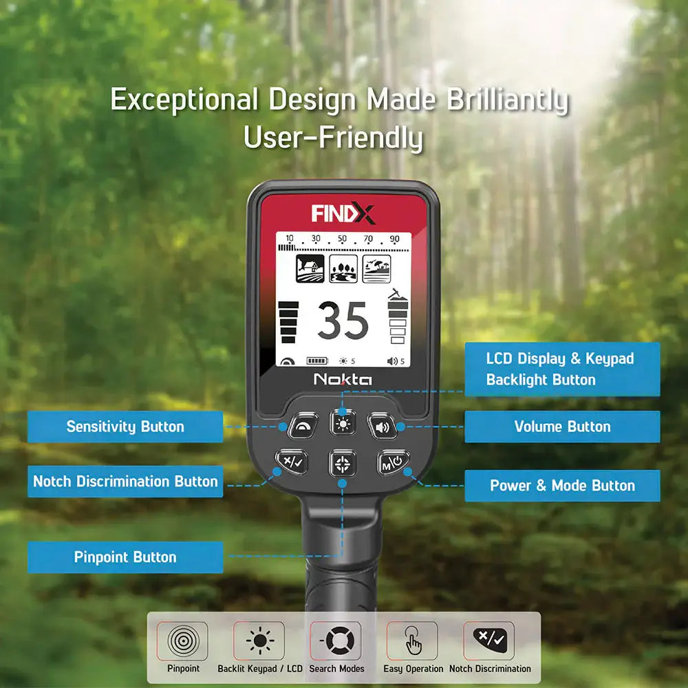 FINDX finner alt – smykker, mynter, relikvier og gull. Med dybdeindikator og justerbart lydnivå blir det enklere enn noen gang å finne skatter, både over og under bakken.