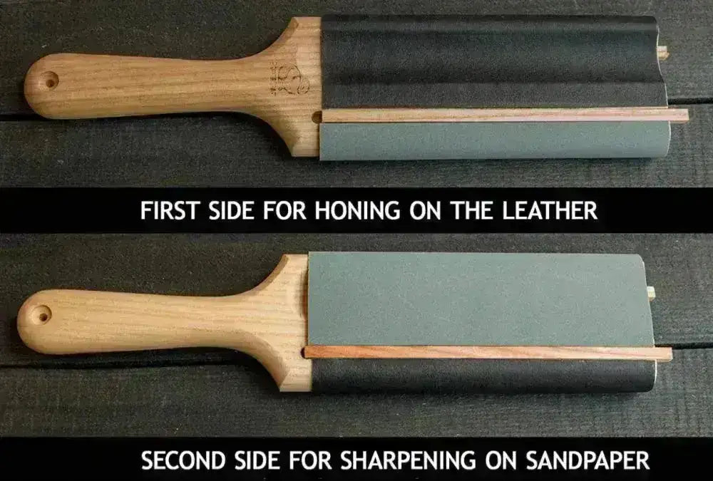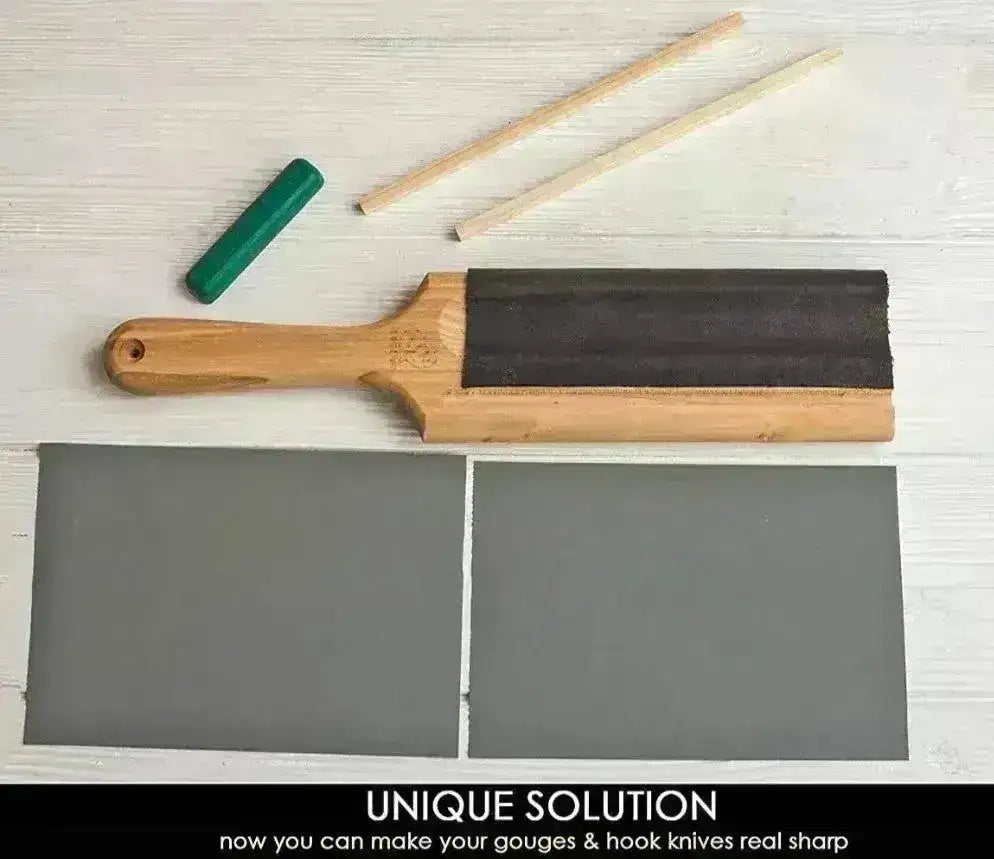 Lohkon toinen puoli on nahkaa ja toinen hiekkapaperia. Mukana tulee sekä vihreä että harmaa kiillotuspasta sekä käyttöohje, jotta voit kiillottaa ja huoltaa veitset täydellisesti.