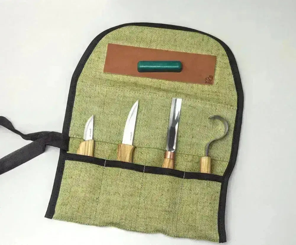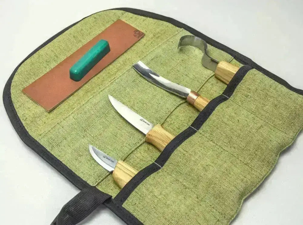 Setti sisältää kolme tarkkuustyökalua: talttausveitsen, yleiskaiverrusveitsen ja tarkkuusveitsen – kaikki on valmistettu terävistä hiiliteräksistä ja mukavista puukahvoista. Kaikki on turvallisesti säilytetty tukevassa, aidosta nahasta valmistetussa pyörillä varustetussa kotelossa, joka on käyttövalmis kotona, työpajassa tai matkalla.