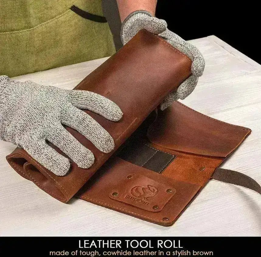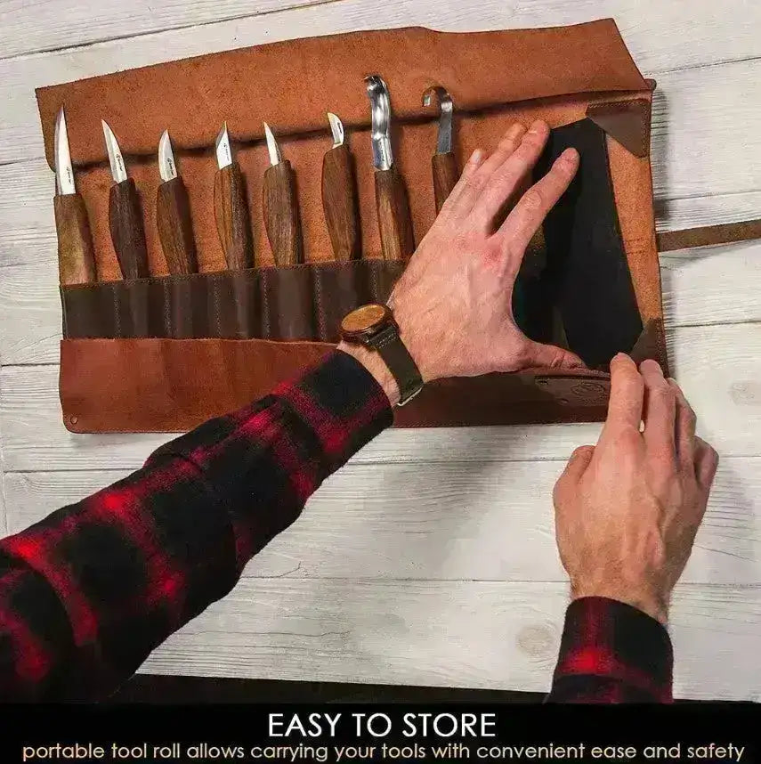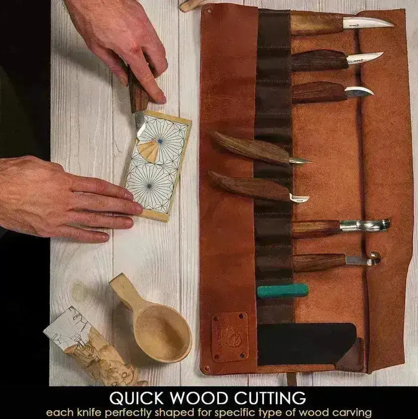 Täydellinen setti, jossa KAIKKI mitä tarvitset veitsiin! Käsintehdyt veitset Ukrainasta. S18X-sarja on täydellinen niille, jotka haluavat hyvän puunleikkauslaitteen, jonka avulla voit muotoilla ja kovertaa puuta tarkasti ja tehokkaasti. Tämän kaiverrussarjan vino veitsi ja taltta sopivat täydellisesti lusikoiden, kulhojen ja vastaavien kovertamiseen, mukana toimitettujen veitsien avulla voit luoda kauniita kuvioita ja yksityiskohtia puuhun - Kaikki tämä käärittynä eksklusiiviseen, tuoksuvaan ja ei vähiten tukevaan nahkakansioon, joka voidaan rullata ylös!