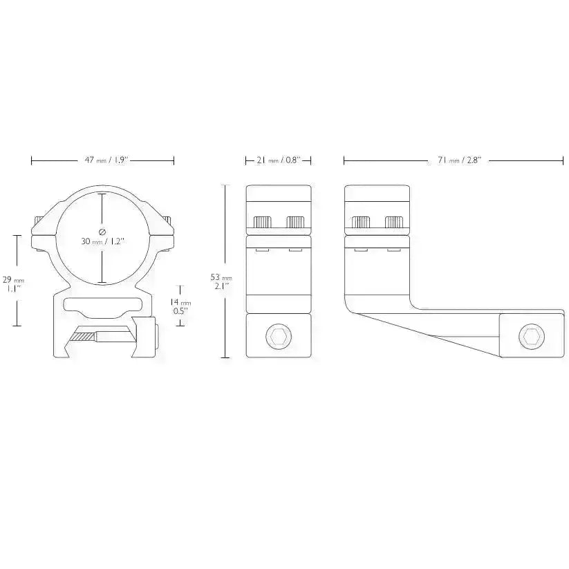 Alumiinikiinnikkeet anodisoidulla mustalla pinnalla. Asennusrenkaiden sisäpuolella on pehmeä ja hieno pinnoite, joka pitää optiikan tiukasti paikoillaan ja estää optiikkaa naarmuuntumasta. Kiinnitysrenkaat ovat korkeat, jotta ne tekevät tilaa leveämmälle optiikalle ja sopivat hyvin hieman suurempien kiikarien kanssa.