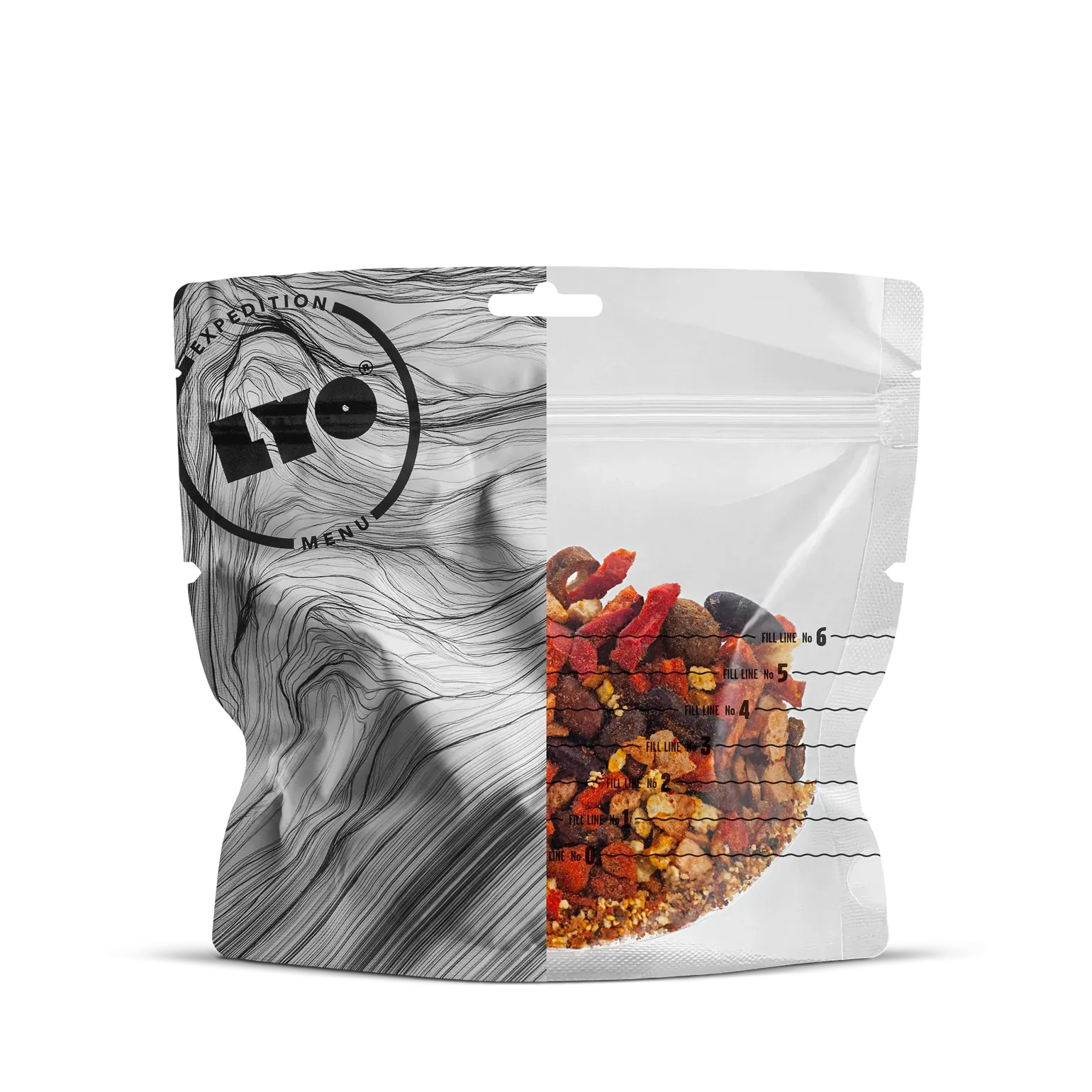 LYOFOOD Chili sin carne leverer ekte meksikansk smak med bønner, ris, paprika og mais i en krydret tomatsaus. En perfekt frysetørket middag for eventyrere som ønsker et vegetarisk alternativ med mye energi. 100 % naturlige ingredienser, ingen konserveringsmidler, lav vekt og lang holdbarhet.