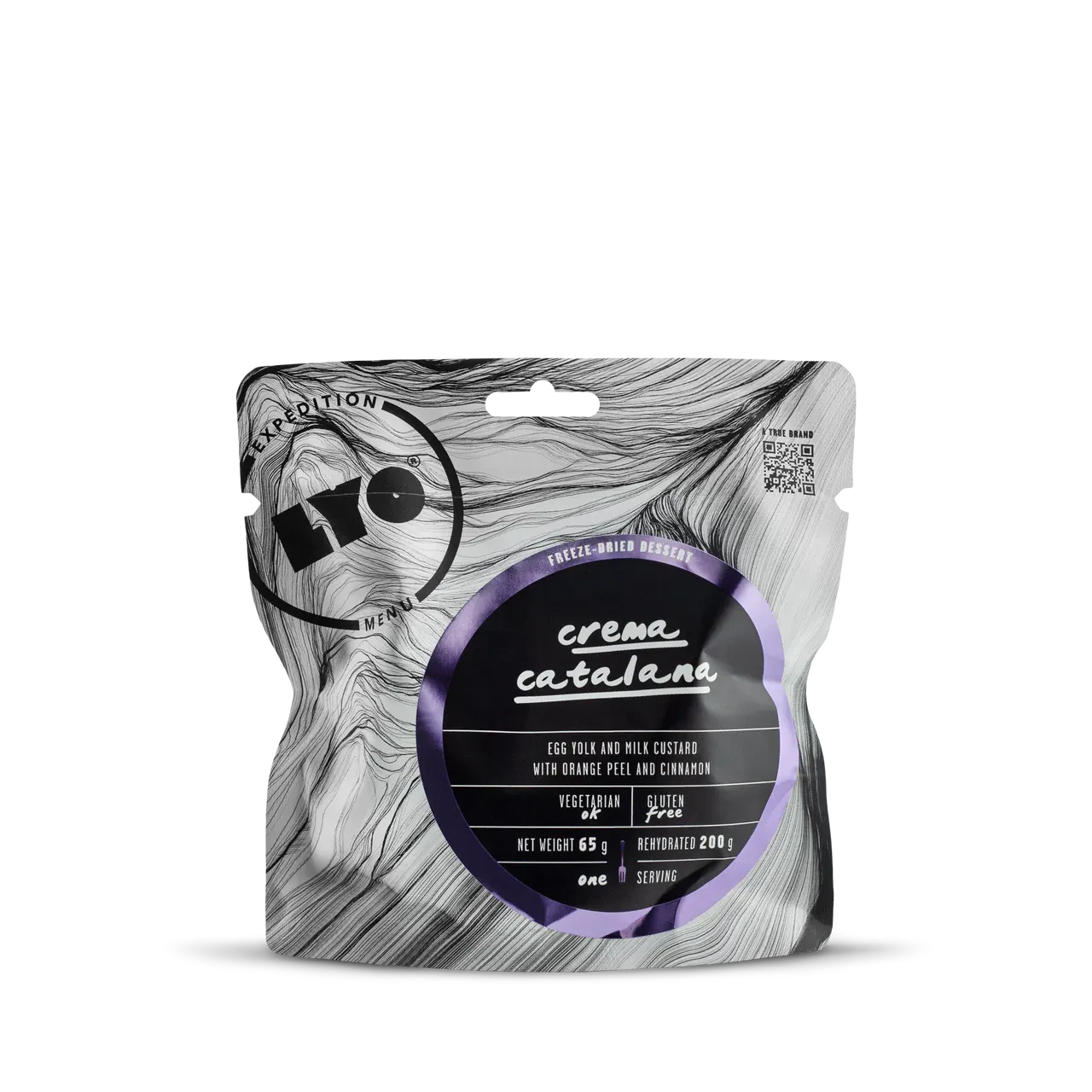 Denne klassiske katalanske desserten bringer smaken av solrike Barcelona til selv de kaldeste og mest krevende ekspedisjoner. LYOFOOD Crema Catalana er laget med melk, eggeplomme, appelsinskall og et hint av kanel – uten kunstige tilsetningsstoffer. Perfekt som dessert eller søt frokost i høyden. Klar på 3 minutter.