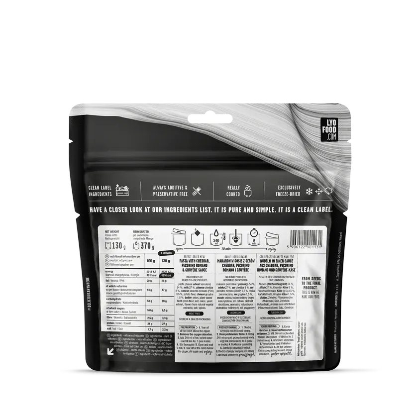 LYOFOOD Mac & Cheese gir deg den ekte smaken av amerikansk ostepasta – i lett og holdbar turvennlig form. Den fyldige retten kombinerer makaroni med en kremet saus basert på ost, melk og smør – alt laget med 100 % naturlige ingredienser og uten kunstige tilsetningsstoffer. Perfekt som rask middag på tur, ekspedisjon eller i beredskapslageret.