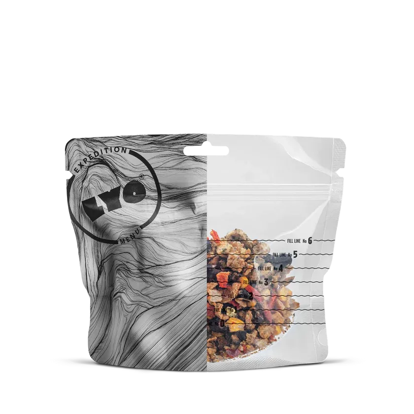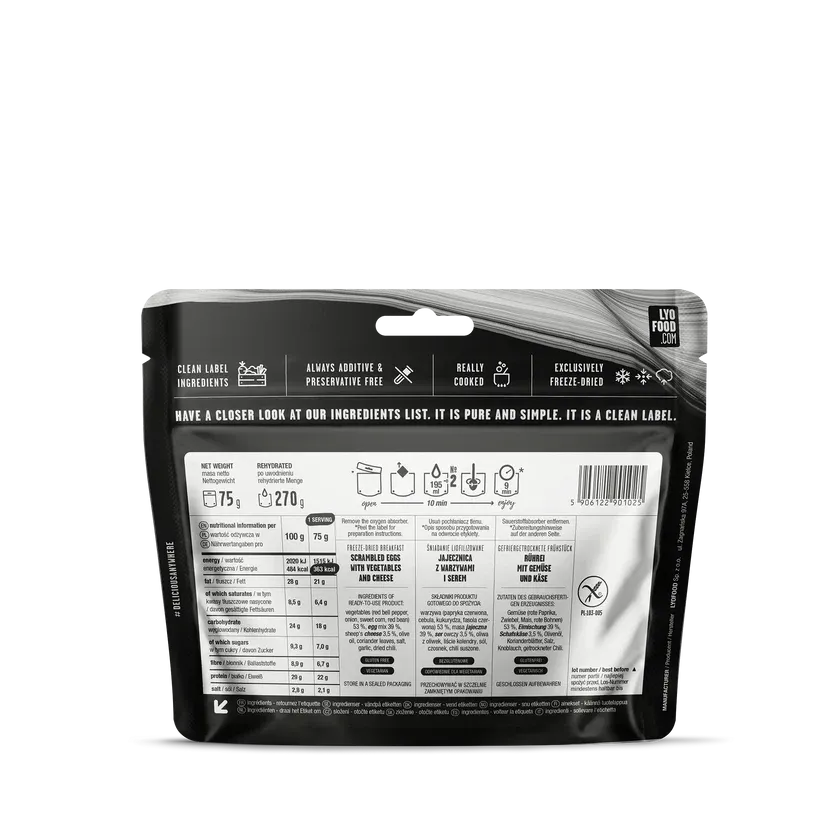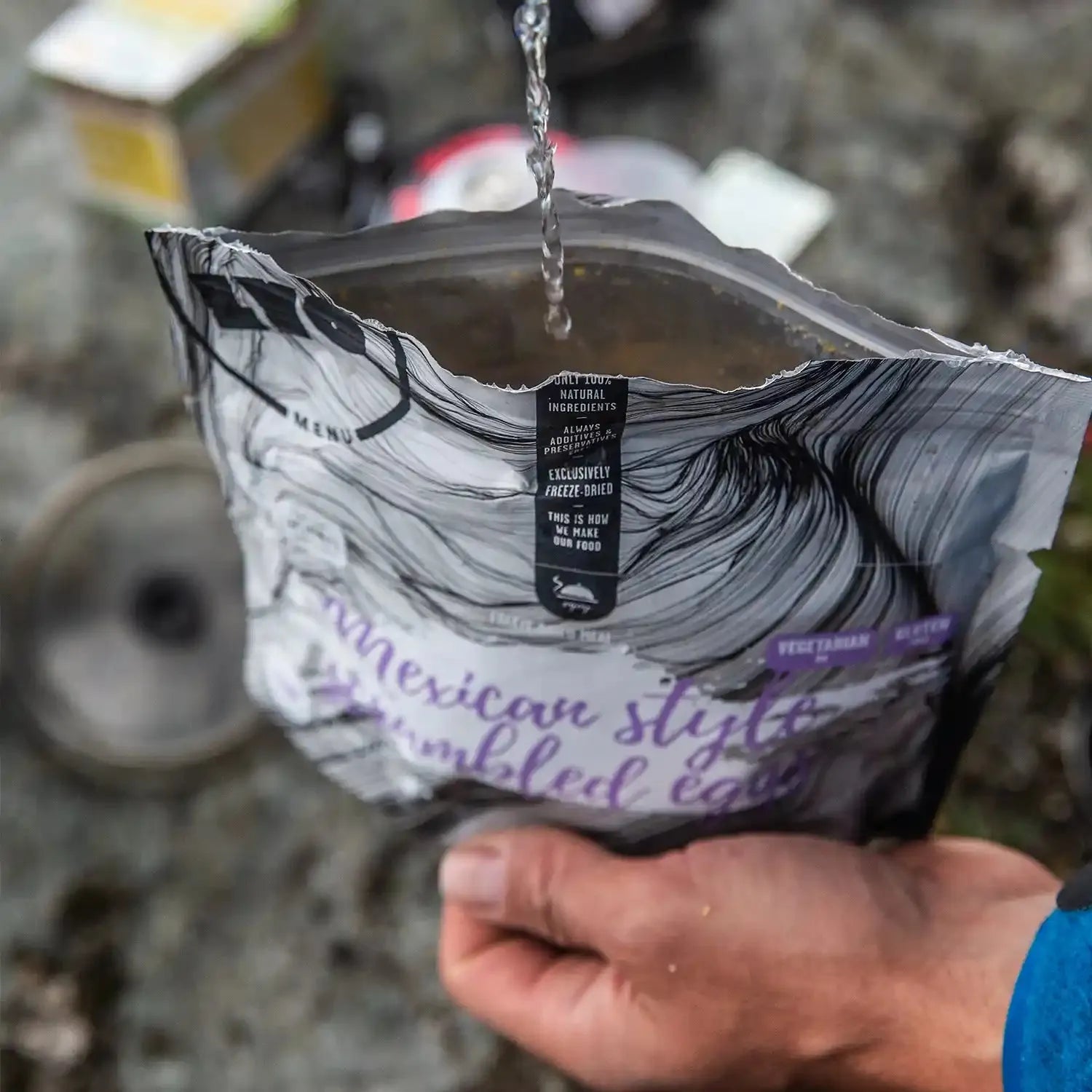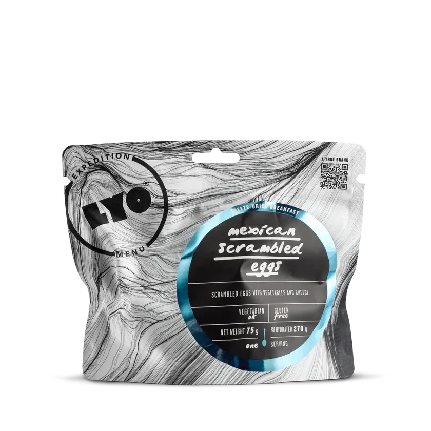 LYOFOOD Mexican Scrambled Eggs er en varm og mettende frokost med krydrede grønnsaker, eggeblanding og ost. Inspirert av meksikanske smaker og laget med 100 % naturlige ingredienser. Retten er fri for konserveringsmidler og kunstige tilsetningsstoffer, og passer perfekt for fjellturer, ekspedisjoner og camping – når du trenger en god og rask start på dagen.