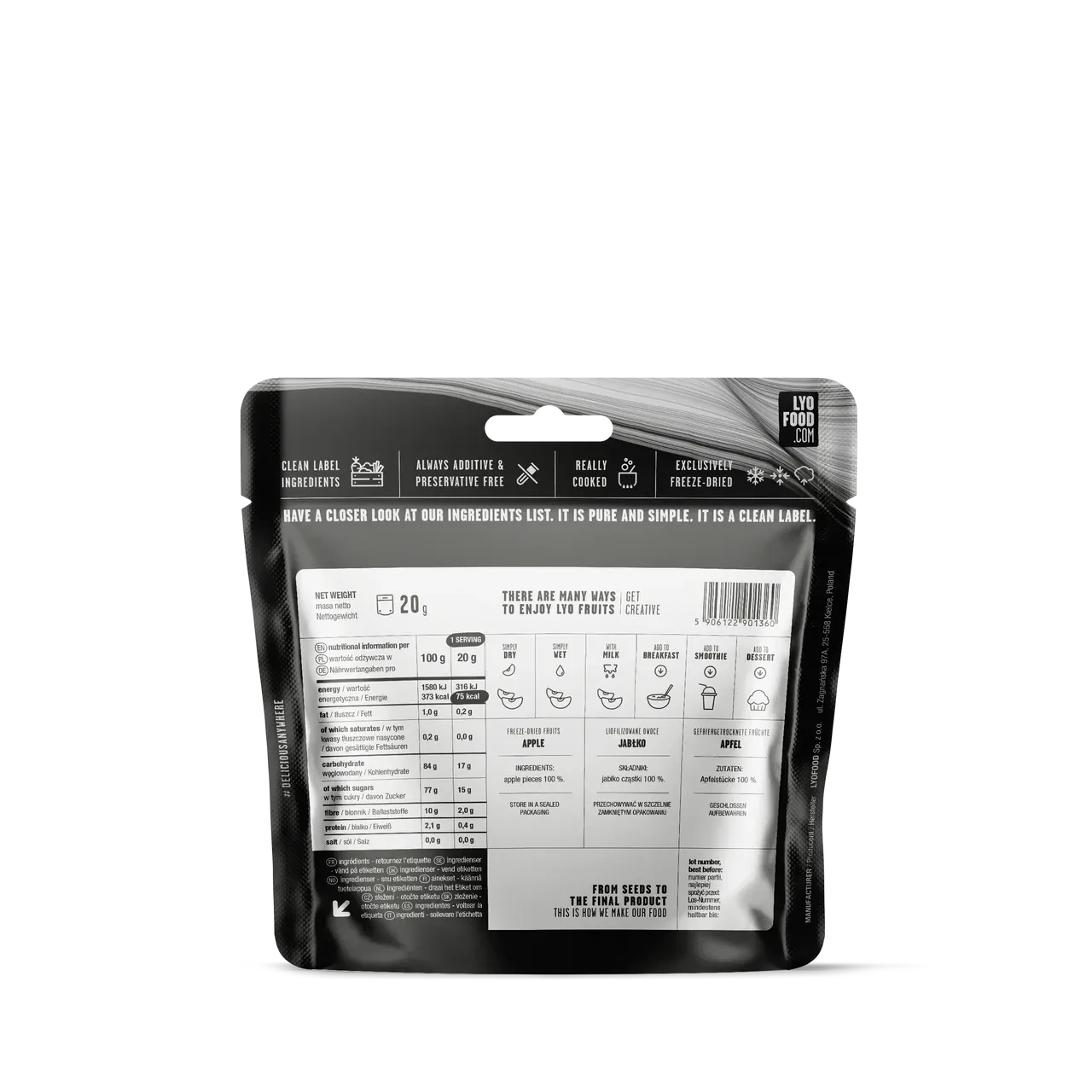 Disse sprø, frysetørkede eplebitene fra LYOFOOD er en ren fruktsnack laget av 100 % epler – helt uten tilsatt sukker eller tilsetningsstoffer. De passer like godt alene som i frokostblanding, smoothies eller som sprø topping på desserter. Ultralett og med lang holdbarhet – ideelt for tur, hverdag og beredskap.