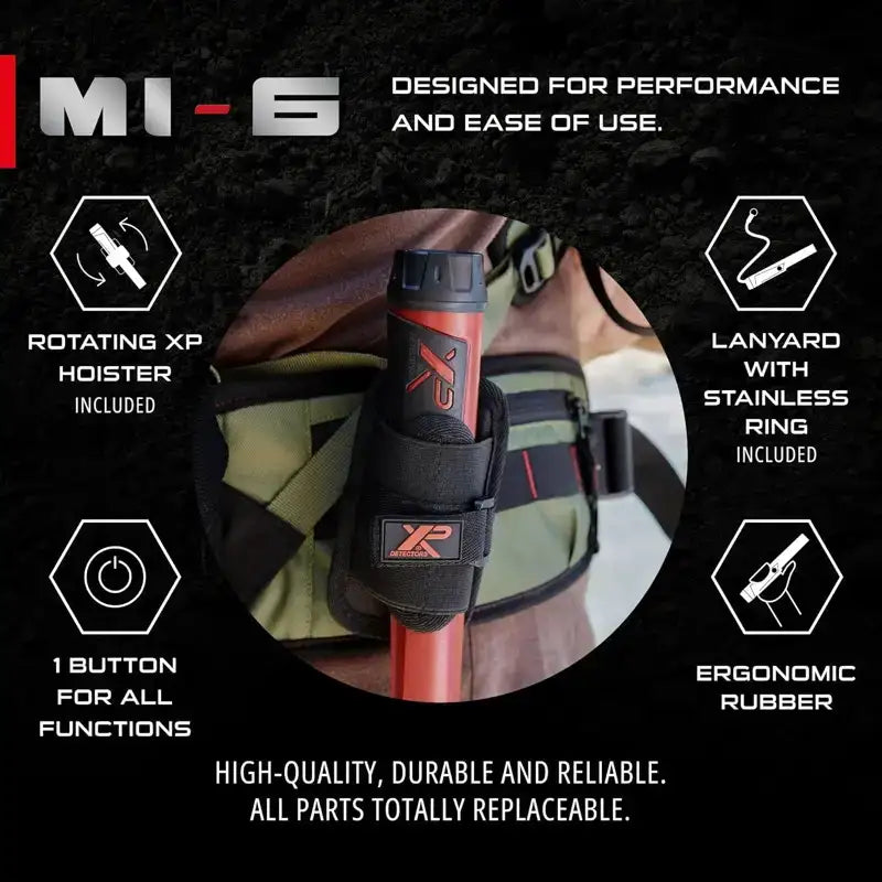 XP MI-6 er utviklet for de som vil ha maksimal ytelse og fleksibilitet i metallsøk. Den er vanntett til 6m, har opptil 90t batteritid og gir flere innstillinger enn standard finsøkere. I tillegg kan MI-6 kobles trådløst til XP Deus eller ORX, noe som gir helt nye funksjoner og en sømløs brukeropplevelse.